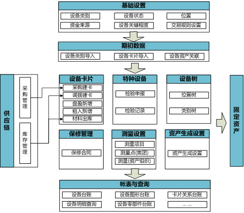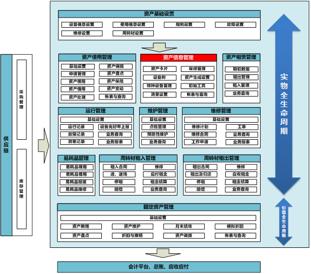 資產信息管理是以管理設備卡片為核心的應用模塊,主要包括:管理設備卡片,各類設備臺賬以及提供特種設備、保修管理、測量設置、初始工具等相關業務管理;它是企業資產全生命周期管理的基礎。資產使用、運行、維修過程中的絕大部分業務,都涉及對設備卡片進行相關信息的回寫,所以可以通過設備卡片了解設備整個生命周期的絕大部分信息。